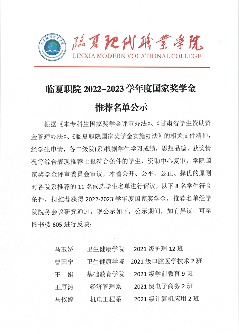 临夏职院2022-2023学年度国家奖学金推荐名单公示