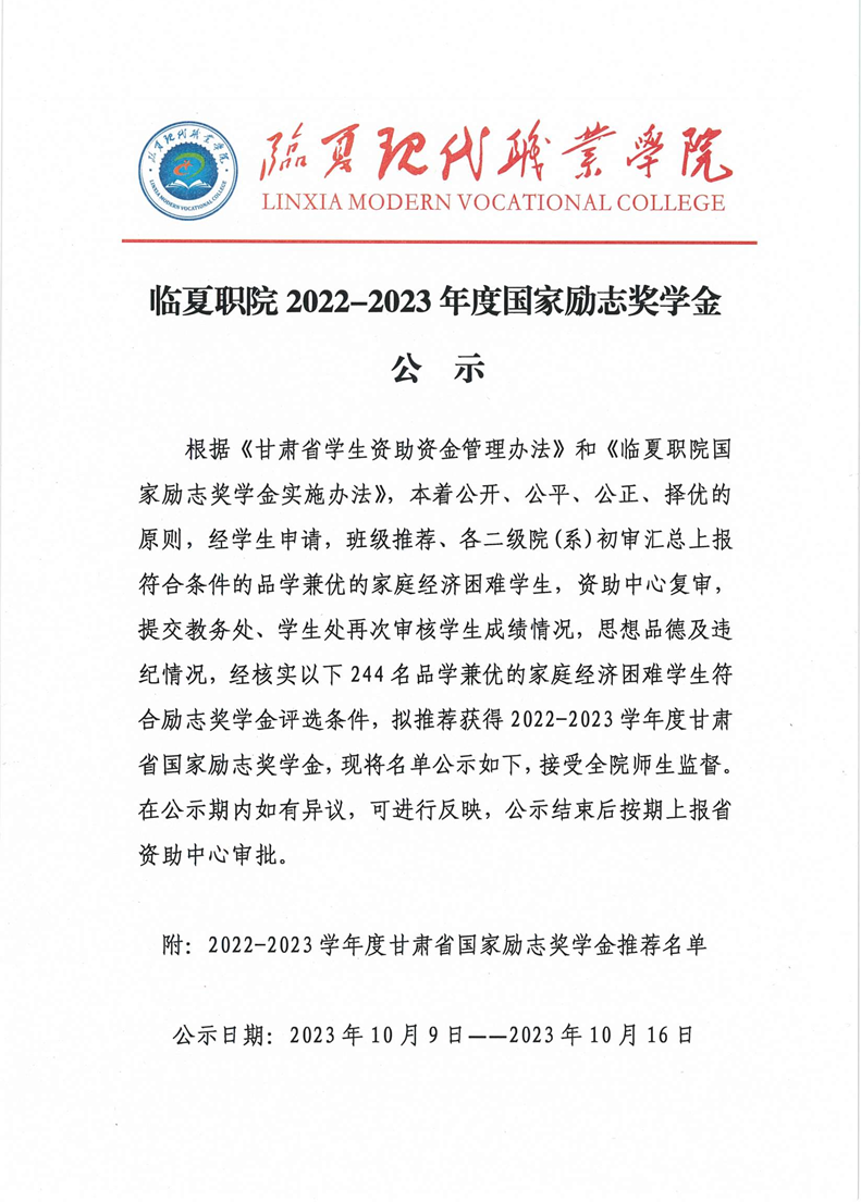 临夏职院2022-2023学年度甘肃省国家励志奖学金公示及名单