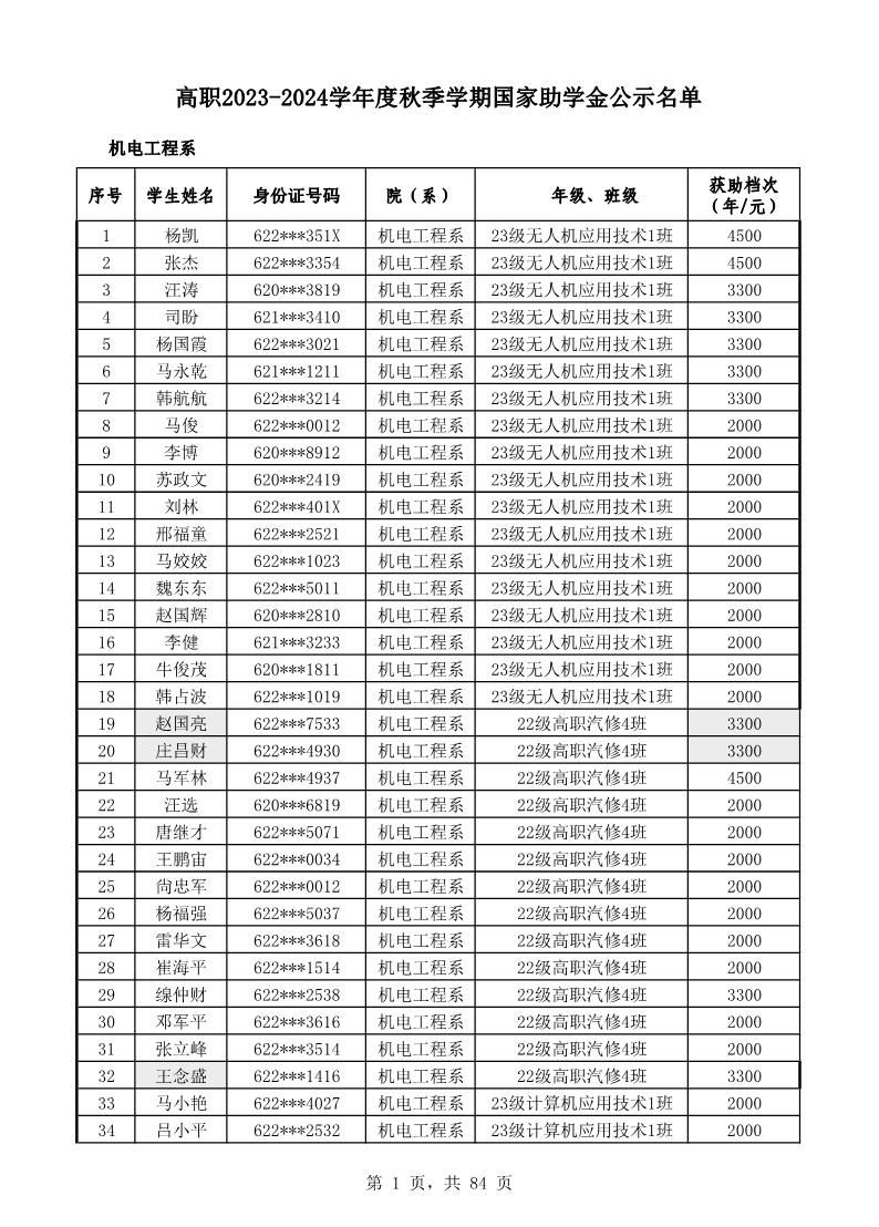 高职2023-2024学年度秋季学期国家助学金公示名单