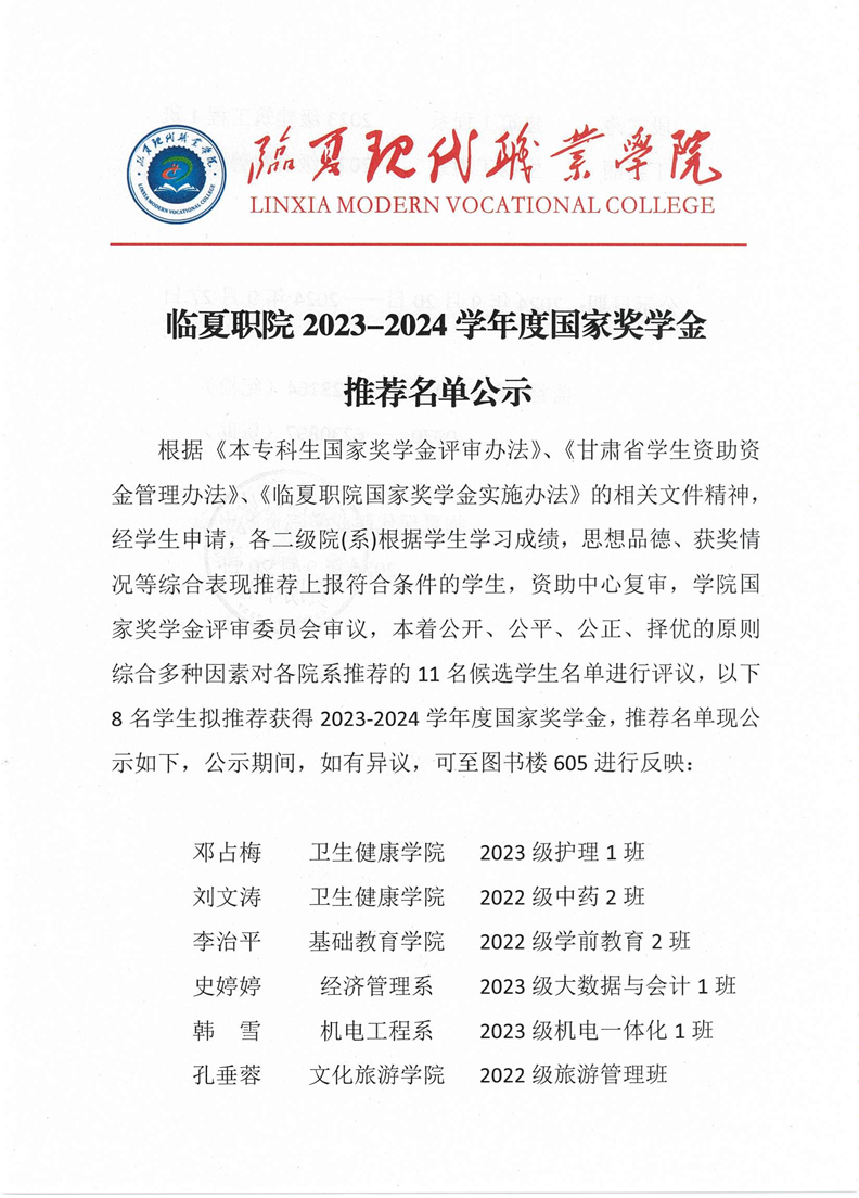 临夏职院2023-2024学年度国家奖学金推荐名单公示