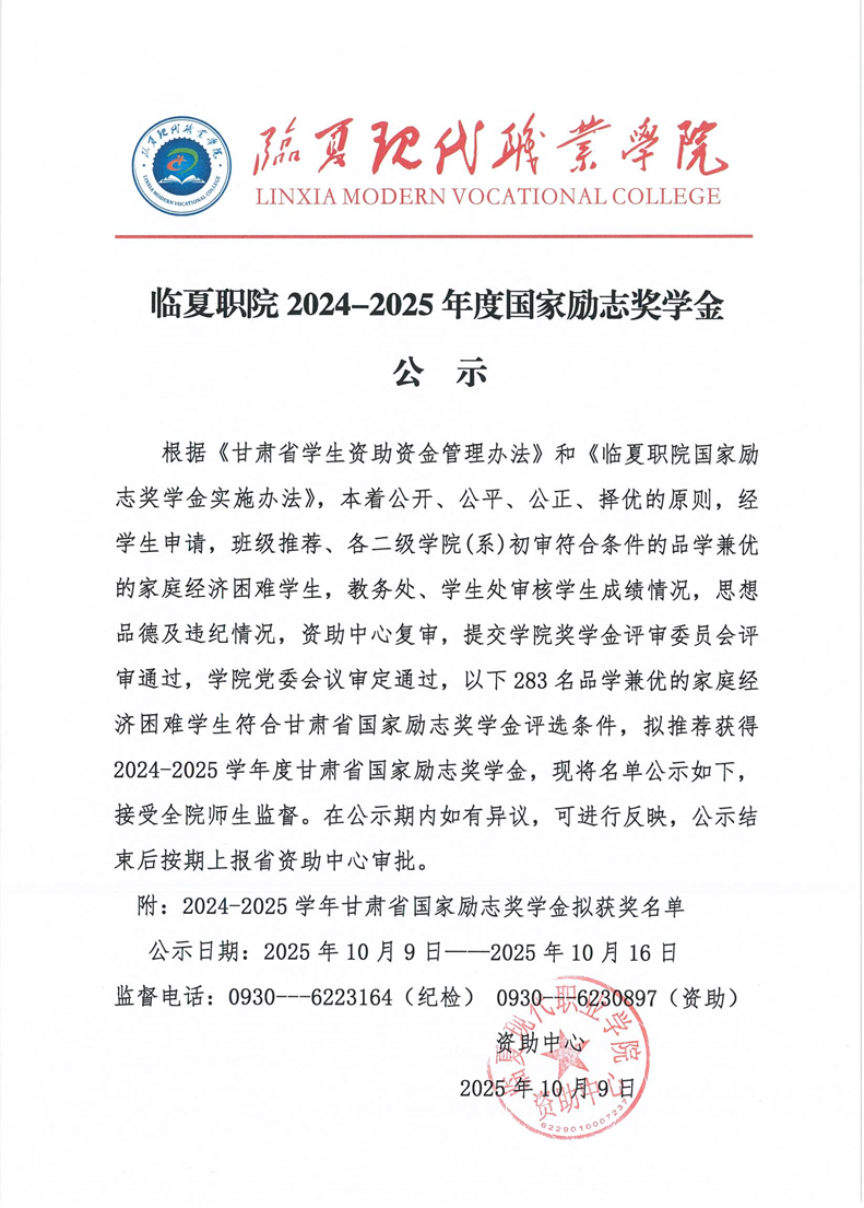 临夏职院2024-2025学年度甘肃省国家励志奖学金公示